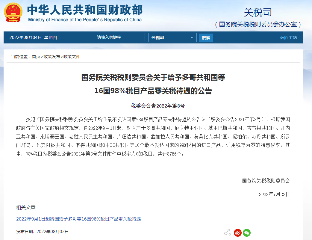 财务部消息,2022年9月1日起,我国给予16个最不发达国家98%税目产品零关税待遇。这16个国家分别为:多哥共和国、厄立特里亚国、基里巴斯共和国、吉布提共和国、几内亚共和国、柬埔寨王国、老挝人民民主共和国、卢旺达共和国、孟加拉人民共和国、莫桑比克共和国、尼泊尔、苏丹共和国、所罗门群岛、瓦努阿图共和国、乍得共和国和中非共和国等16个最不发达国家。